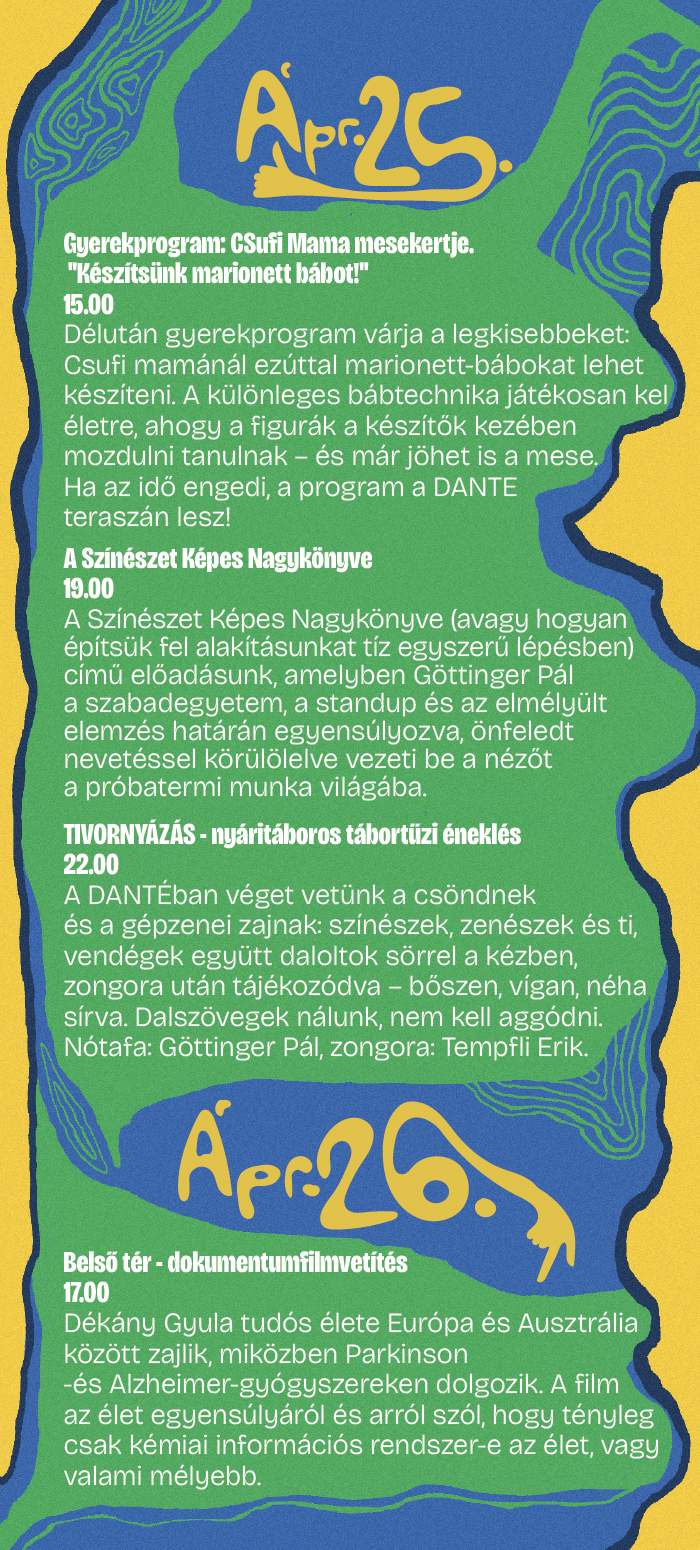 A fesztiválon összesen 9 esemény várja a látogatókat, ebből 6 ingyenesen látogatható, 3 pedig jegyvásárláshoz kötött.